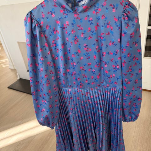 Nydelig blå kjole med rosa blomster str. 36/38 🌸 kjolen har 3/4 arm og er lengre bak. Lite brukt.