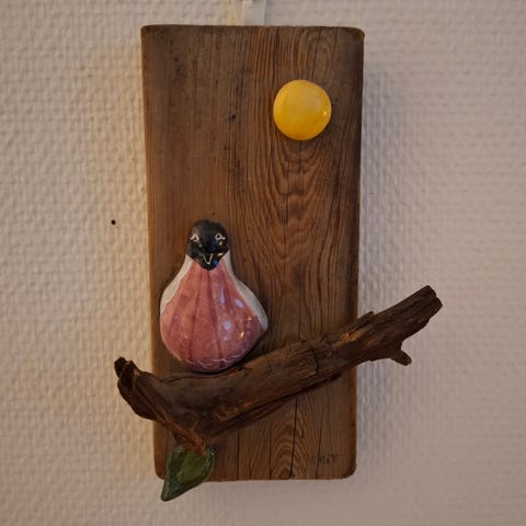 Nydelig fugl i keramikk med mørk blå glasur selges for kr 120,-.