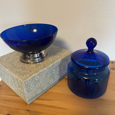 Selger denne flotte glassbollen med lokk. Den kobolt blå glassbollen har hvitt blomstermønster.