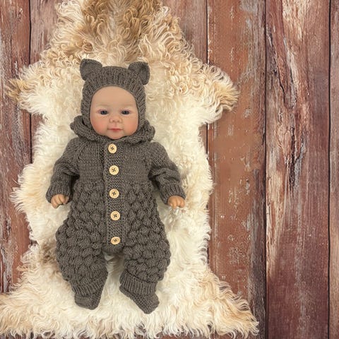 Alpakka kjeledress til baby fra 3 til 6. måneder i økologisk farger med lommer. Lue kan trykke opp knappene av det samme på bena for å skifte bleie. Fint presang.