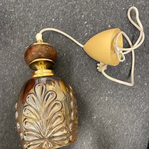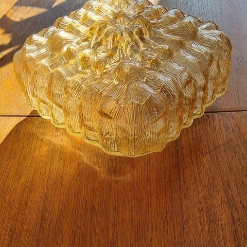 Flott massiv taklampe i lys okerfarget, gir varmt lys. Ledninger er nye. Veldig flott, nydelige brytninger i glasset, Kult design med firkanter med børstet overflate. Trenger normalt godt feste i taket !