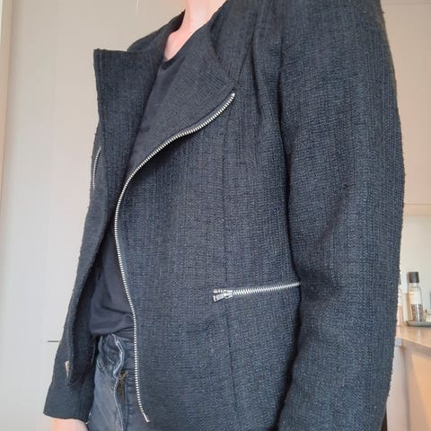 Pent brukt. Fasongsydd jakke med glidelås. Bomull med artig mønster. Splitt nederst på ermene, slik at de kan brettes opp.