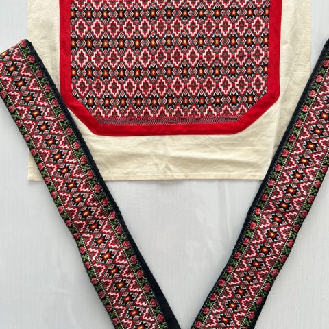 Broderer/perler og monterer bringeduk, belte og fangband (og annet bunadstilbehør) i korssting eller perler (små perler som dekker hele arbeidet).
