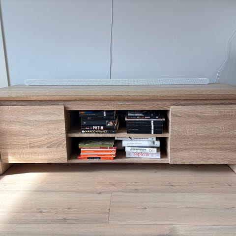 TV-benken har en romslig, uttrekkbar skuff med demping for myk lukking. På baksiden er det utskjæringer både oppe og nede, slik at du enkelt kan trekke ledninger fra TV til stikkontakt – alt holdes ryddig og skjult. Fjernkontroll-signaler går fint gjennom den lukkede skuffen, noe som gjør den ideell for oppbevaring av modem, bokser og kabler.