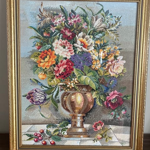 Nydelig bilde sydd med heldekk korssting og profesjonelt innrammet i solid gullfarget treramme. Bildet måler 64*56 cm. Kan sendes mot porto.