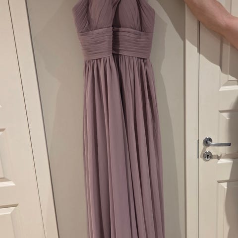 Sitter veldig fint på, med glidelås i livet, og draperinger som gjør kjolen flatterende over magen. Lårkort modell. Skulderputer, og lange ermer. Lett og luftig stoff.