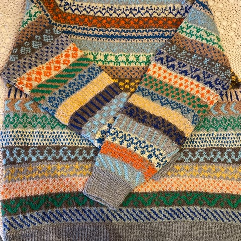 Det er også en tynn, rustrød glittertråd i strukturen oppe på genseren.