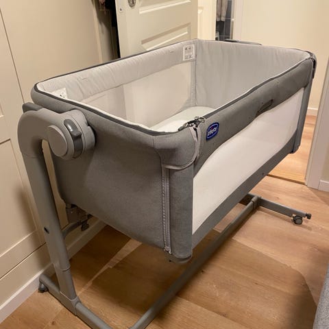 Pent brukt bedside crib. Ene siden kan bøyes ned. Sengen har hjul og kan enkelt gjøres om til en vugge. Følger med madrass, chicco madrassbeskytter og flere laken.