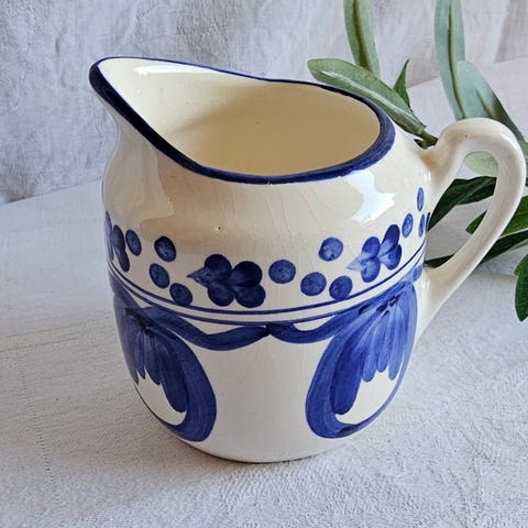 Fransk keramikk vannmugge og bolle (hane og blomster)
