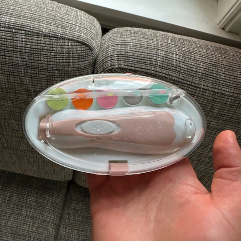 Baby nail trimmer that comes with a variety of head options with different textures for different levels of trimming. There is also a light that comes on when you turn the machine on to help see better. So much easier than cutting baby nails 🙌🏼