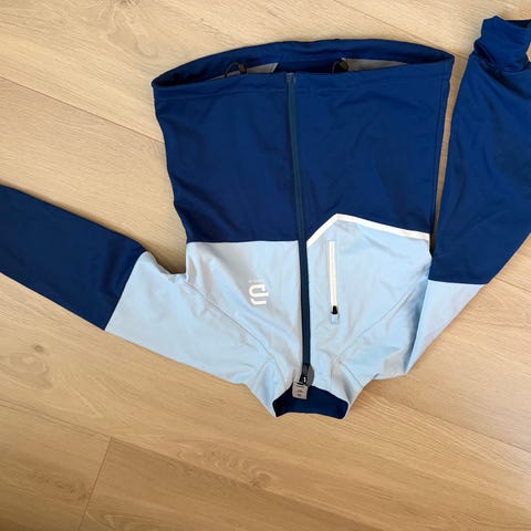 Pent brukt /lite brukt sykkeljakke / løpejakke. Den er tynn i stoffet og har strikk rundt livet for å sitte godt inntil kroppen.