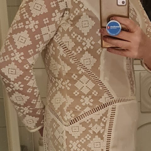 A custom-made wedding dress with a nice pattern. It doesn't show so well in the pictures, therefore it's best to come see and try on the dress.Bridal veils have the same pattern on the front as the dress.Gloves are not included as I don't have them now.I also have other bridal accessories in a different ad her on finn.no or you can ask me directly here on message.