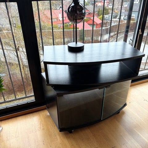 TV-bord med dreieskive og glassplate, 2 hyller med doble glassdører. Hylleløsning for cd o.l. innvendig og på utsiden. Stilfullt.