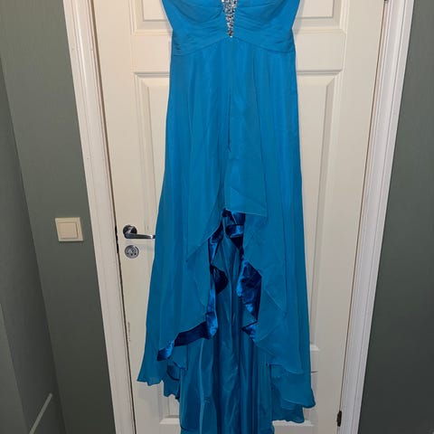 Synes denne vakre spesial bestilte kjolen er for fin til bare å henge i skapet å har blitt for liten for fruen i en vakker blå farve med fine detaljer selges denne nå i håp at noen andre vil skinne å bli lagt merke til kjolen i str 38/40. Selges til en helt fantastisk fin pris bud over prisantydning som er 450kr + evt frakt