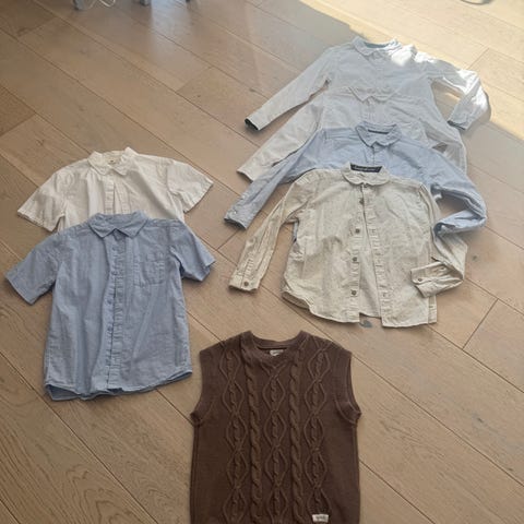 Klespakke med 10 plagg. Pent brukte finklær til gutt i str. 122-128.