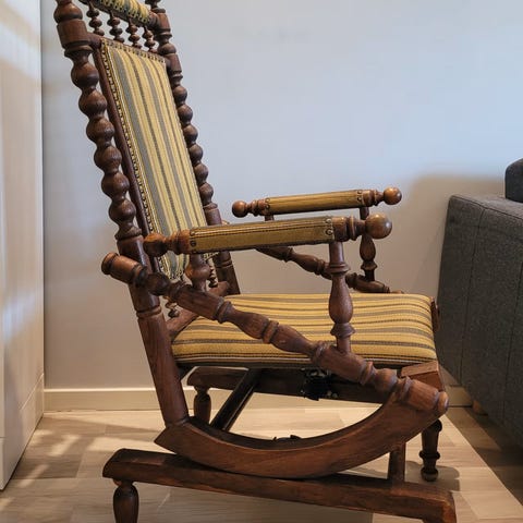 Amerikansk gyngestol, står umontert, alle deler er der, har fått plate i rygg og sete, har ikke stoff til den, toppdekoren på ryggen er delvis løs/noe mangler, treverket er ikke pusset eller endret / helt orginal.