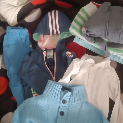 Selger fine festklær som klespakke til gutt i størrelse 86. Klær er fra Newbie (grå skjorte, mørkeblå bukse, mørkeblå genser med bamser), H&M (hvit skjorte med mørkeblå vest) og amerikanske Carter's (rutete skjorte)