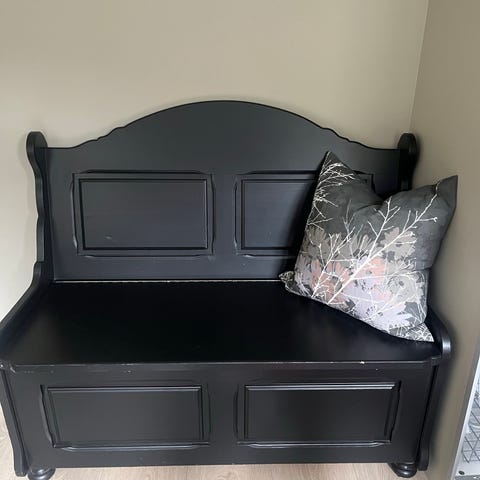 Nydelig benk, nyoppusset i furu og malt i dempet sort. Lokket er pusset helt ned og resten er grunnet og 3 lag med maling. Malt innvendig med vakker tapet i bunn.