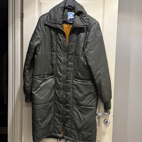 Mørkeblå parka med burgunderrødt fôr som er vattert. Polyester/nylon. Muligheter for å stramme i liv og nederst. Blir dessverre for lite brukt av meg…