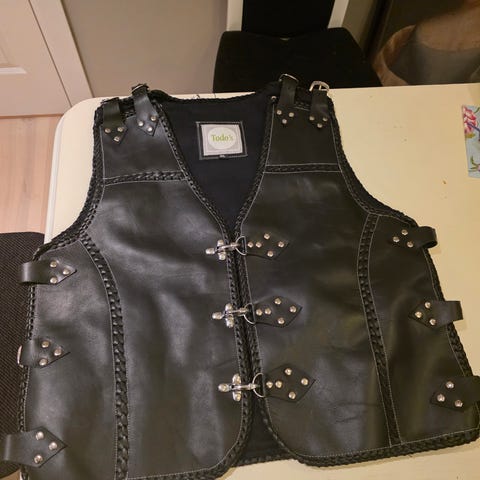 Denne skinnvesten er en av de klassiske klubbvestene du finner på nettet og alt er gjort klart for deg med lapper og lignende. Med den klassiske retro-looken er denne vesten et must for de som ønsker å bli sett. Vesten kan brukes som en vanlig skinnvest over tishanen.