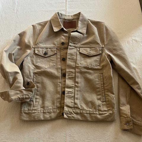 Jakken er i farge beige og størrelse 50