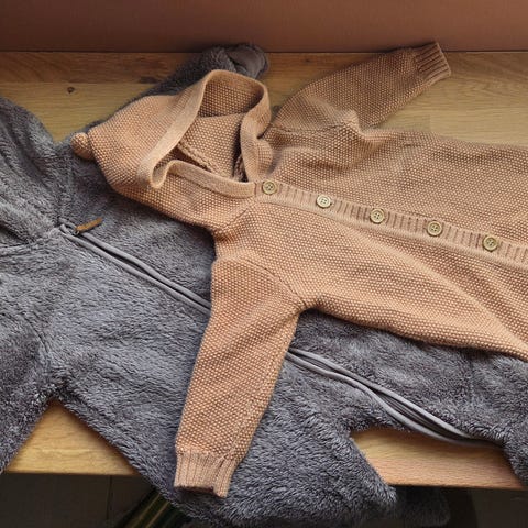 Ulldresser fra Joha størrelse 60. Den brune er brukt av to barn, fortsatt supermyk, med nupper som seg hør og bør med ullfleece. Glidelåsene er spesielt fine med tanke på å ta av og på barnet, spesielt dersom barnet sover. Flappene på hender og føtter, kan brettes rundt, så man slipper votter og tøfler. Beskytter på glidelåsen, mykt for haken. Deilige dresser, som vi ha kjøpt i neste størrelse også!
