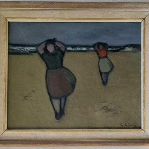 Om kunstneren (fra Store norsk leksikon). Alf Løvberg er en norsk maler. Hans uttrykk karakteriseres av enkle former og en dempet fargeskala. Stemningene som skapes pendler mellom melankoli og humor. Utdannelse: Alf Løvberg var elev av Christian Krohg og Halfdan Strøm ved Statens kunstakademi høsten 1922. I 1936 reiste han til Paris og ble elev av Marcel Gromaire. Året etter, i 1937, fikk han undervisning av Aksel Jørgensen ved Kunstakademiet i København. Enkelhet i maleriene: Løvbergs malerier har en stillferdig kvalitet. De er koloristisk enstonige med store, enkle figurer. Hovedvekten ligger på grålige eller matte fargetoner. Hans forenklede formspråk har slektskap med Marcel Gromaires uttrykk, med forankring i det naturalistiske. Samtidig har Løvberg en nær samhørighet med den danske tradisjonen som legger vekt på en konsentrert ro. Motivene er gjerne anonymiserte figurgrupper og natur, gjerne danske landskap. Han bruker stiliserte, forenklede grunnformer, og veksler mellom vare avgrensninger mellom fargene og skarpt formulerte skiller ved hjelp av en tydelig, sort konturlinje.