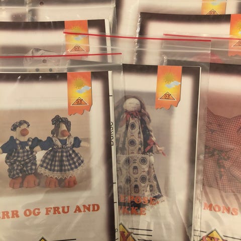 Ubrukte mønsterpakker til kosedyr. Engelsk tekst. Kr. 30,- pr.stk.