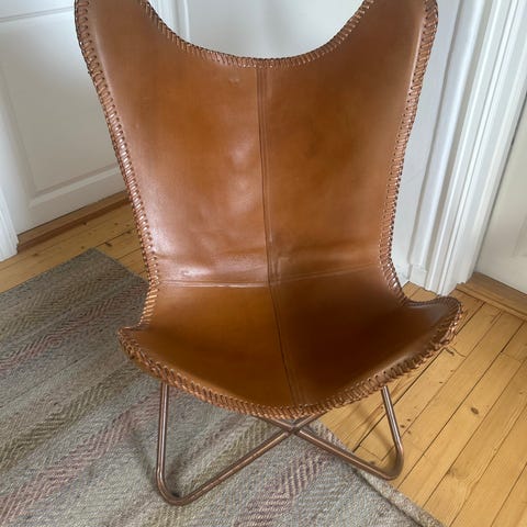 Stikkord: Butterfly stol, skinnstol, lær, lenestol, A.Huseby, Tannum Møbler, Expo Nova, garver skinn, svensk design, nordisk design.