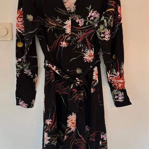 Ny maxikjole oversize str. S med volang selges. Passer til størrelser M/L. Den utsvingt maxikjole i crêpet, vevd viskosekvalitet med bølgende volang foran og over den ene skulderen. Rund hals og åpning bak med skjult knapp i nakken. Lange ermer med vertikal volang bak. Ufôret. Viskose 100%.