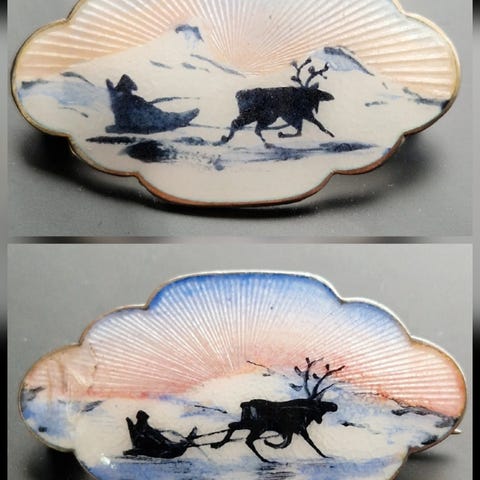 Veldig pen sølv og emalje nål med reinsdyr og slede i solnedgang