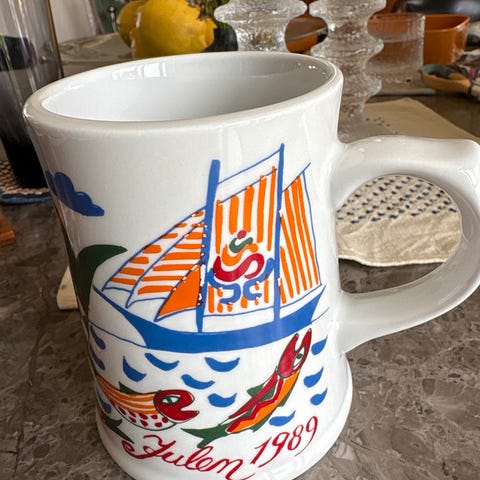 Figgjo Flint krus med dekor fra Hennig Olsens is flettet innimellom. Utgitt julen 1989