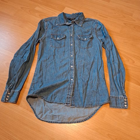 Skjorte eller bluse i denim fra Ralph Lauren - str 4 - som jeg mener tilsvarer str 36. 100 % bomull - lys blå - «washed». Lite og pent brukt. Ligget i skapet i flere år - dessverre blitt for liten. Fargen på skjorten er friskere enn på bildet.