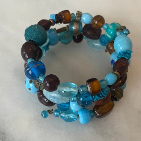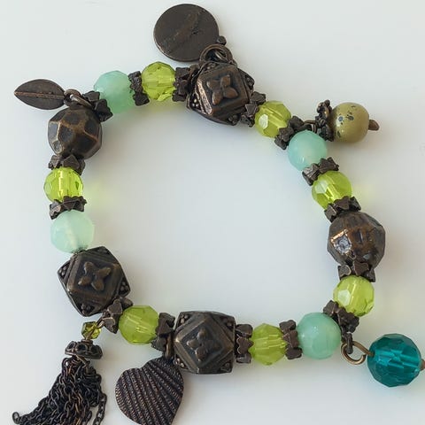Vintage nydelig armbånd 🌟 med strikk, slik at det passer til de fleste. Turkis / sjøgrønn, perler med fine endestykker og «skinnende diamanter», et løvblad / palmeblad og en sommerfugl med tre «diamanter».