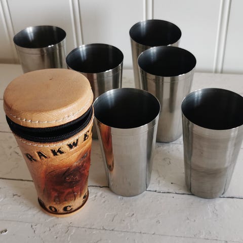 Vintage tursett med kaffekopper/skåler og kanne i plast.