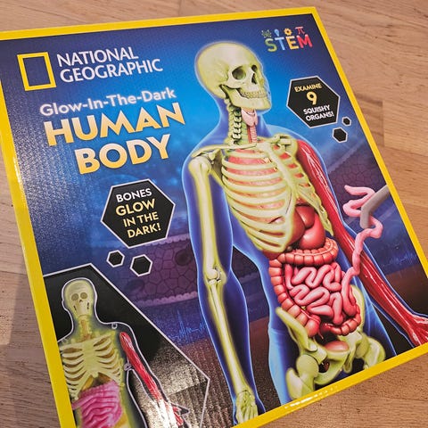 Miniatyrmodell av menneskeskjelett med illustrasjoner. Stativet til å feste det på har fått seg en knekk, ellers er alt i meget god stand.