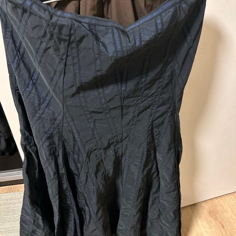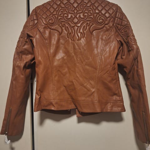 Jakken er skinnlignende i str 42. Ikke brukt. Foret og med lommer, glidelås.