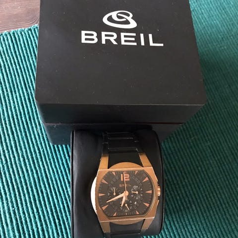 Breil Milano armbåndsur/klokke/ur. Dameur dress. Sort tallskive 28 mm. Kassen måler 32 mm. 10 mm tykk. Glass små riper godt brukt. Trenger nytt batteri. Stainless steel. 1406. 3 Atm. Water resistant. Tåler vannsprut. Fellespenne i stål. Baksiden av urkasse er solid. Målt rundt håndleddet ca. 17 cm. Kan ta av ledd. Ref. 2519740642 modell fra 2012 med chronograph. Vei.pris var 3990,-