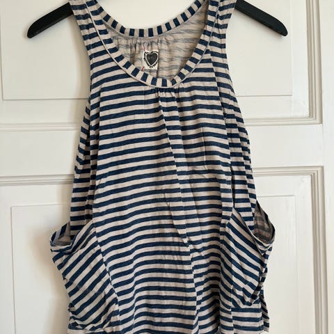 Søt topp med blå striper på hvit bakgrunn. Med blonder.