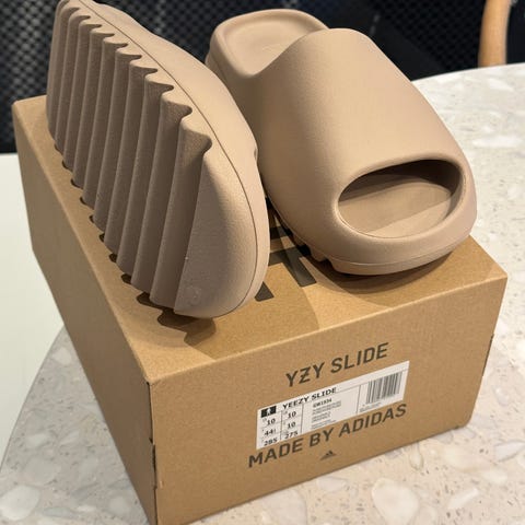 Selger helt nye Yeezy Slide Azure. Disse er kun tatt ut fra esken for bilde og kjøpt fra Adidas (Confirmed).