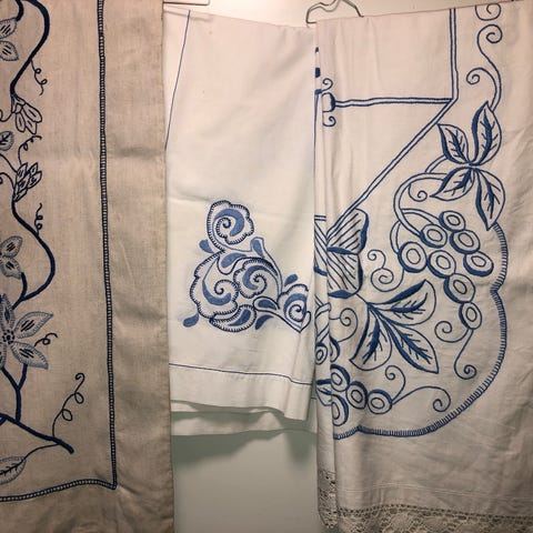 Selger to vakre duker i forskjellige størrelser og design. Begge er i pent stoff, hvor én er flott brodert med fine detaljer – perfekt til både hverdag og fest.