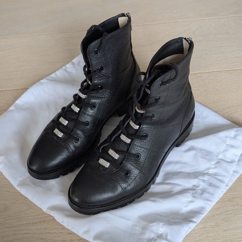 Jimmy Choo biker boots størrelse 38,5 selges. Som nye! Fargen er beige med grønnskjær i seg. Bud kan mottas!