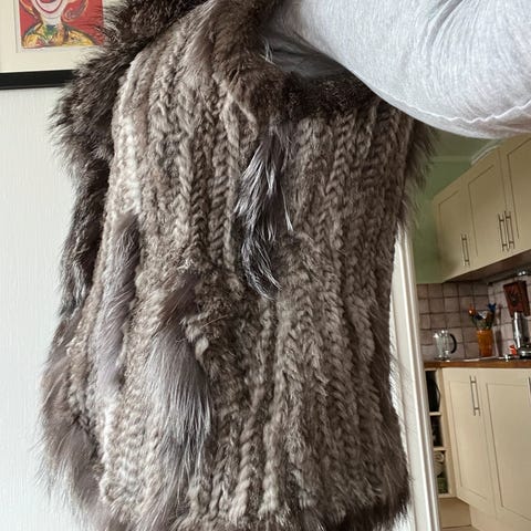 Grå med flotte detaljer, kan bæres åpen eller knytes igjen. Passer str S og M. Pent brukt.