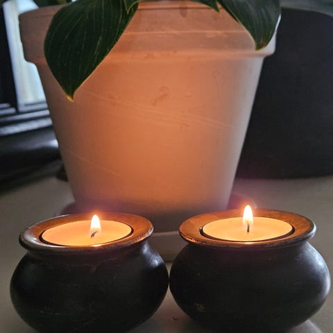 Telysholdere i tre, var kjøpt i Thailand.