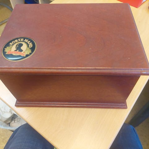 Ekte antikk / gammel treboks - regner med det har vært til sigar etc. Den er tom. Pen stand. SORTE MAND 3