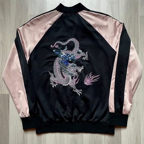 Selger en fin, svart, kinesisk slåbrok. Den har løst belte, 2 lommer i front med broderi og 1 stor brodert kinesisk drage på ryggen. Unisex