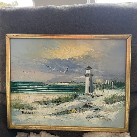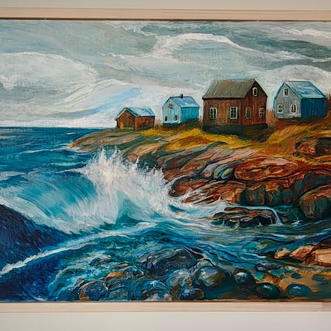 Et fornøyelig bilde malt av Kråkenes Fyr. Usikker hvem som har malt det. Tror akryl.