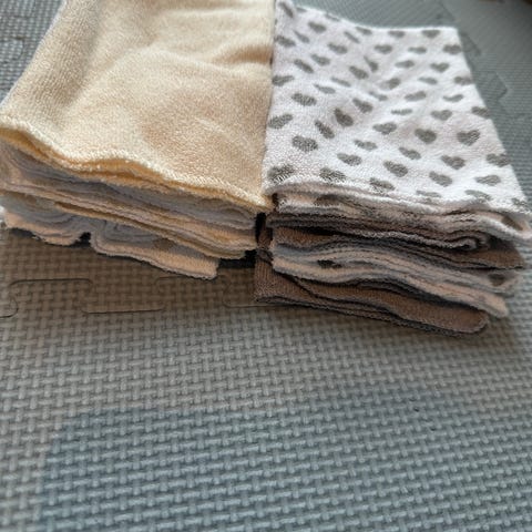 To pent brukte sett med flanellkluter/stellehåndkler selges for 65,- Tre store og seks små. Viser normal slitasje etter pent bruk, fortsatt delikate og uten flekker.