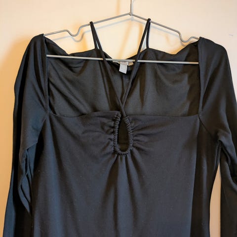 Kun brukt én gang. Tynn, sort kjole med blondedetaljer i midja, samt fra midja og opp til under armen på sidene. Kjolen er lenger bak enn foran. Supersøt :)