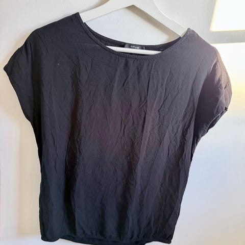 Svart t-skjorte med lomme, to ulike stoff. Str 32/34.